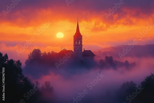 © video, Obraz premium Church Tower in Misty Autumn Sunrise Landscape with Warm Orange and Purple Hues in Peaceful Countryside Village
