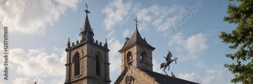 © Supharak wonginyoo, Fototapeta premium Church tower with a distinctive finial and weather vane, Weather Vane, Architecture