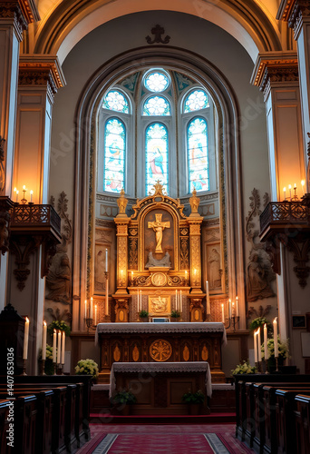 © KWY, Fototapeta premium church with a large alter and stained glass windows