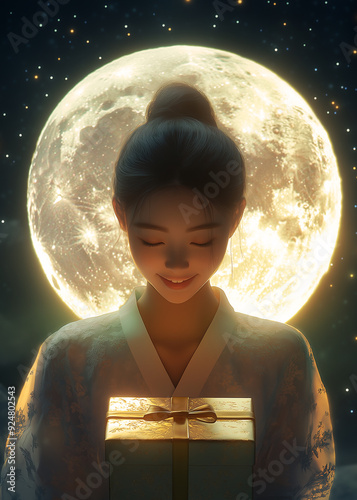 © bluecreamy, Fototapeta premium Chuseok, a Korean Traditional Autumnal Holiday template with a female character, wearing a Hanbok, smiling and holding a present with a moon, for Korean Thanksgiving Day, the Asian Mid Autumn festival