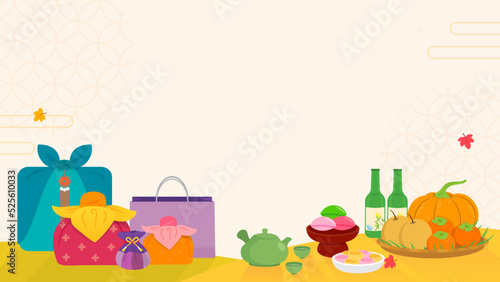 © Farosofa, Fototapeta premium Chuseok Korean thanksgiving day gifts vector illustration. Traditional wrap presents and Chuseok food.