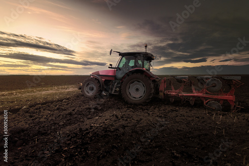© Dusan Kostic, Fototapeta premium Ciągnik orze pola o zachodzie słońca