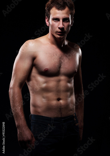 Fototapeta premium Ciało młodego mężczyzny mięśni, studio ciemne tło.