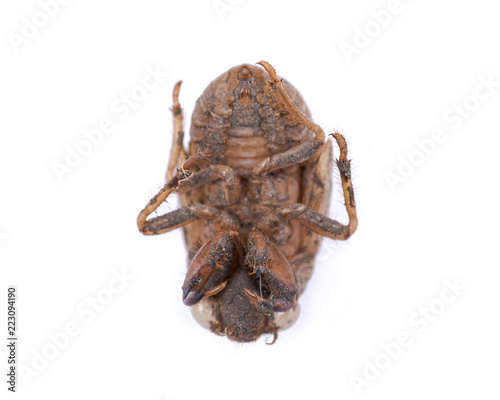 Fototapeta premium Cicada nymph shell (exuvum) isolated on white background. Periodical cicada...