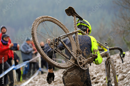 Naklejka premium ciclocross competición ciclista con la bicicleta al hombro en pista de barro país vasco 4M0A4594-f18