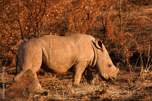 © robbyh, Naklejka premium Cielę nosorożca białego podąża za matką