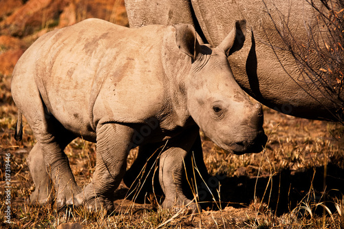 © robbyh, Naklejka premium Cielę nosorożca białego trzymające się blisko matki