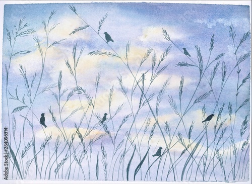 © Patricia, Obraz premium CIELO AVES PAJAROS VUELO FONDO NUVES LUZ ACUARELA
