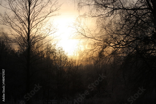 © Magdalena, Fototapeta premium ciemne drzewa i krzaki z zachodzącym słońcem w tle