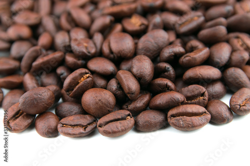 Naklejka premium Ciemne ziarna kawy umieszczone na białej scenie.
