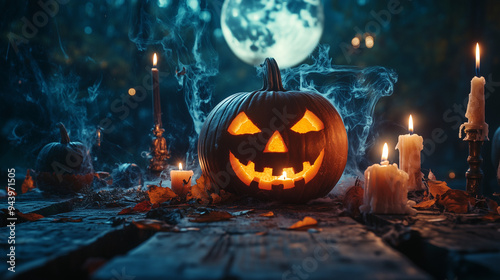 © Sawyer0, Fototapeta premium Ciemny, mroczny las z pełnym, świecącym księżycem stanowi tło dla drewnianego stołu, na którym znajdują się dynie-jack-o'-lanterns z płonącymi świeczkami.