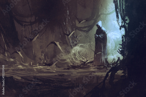 Obraz premium ciemny płaszcz w tajemniczym lesie, czarodziej, czarownik, ilustracja