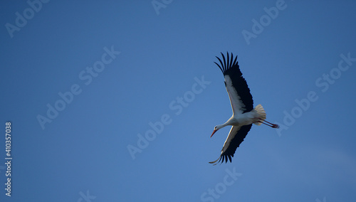© J.K.Ruiz, Fototapeta premium Cigüeña volando en un cielo azul con sus alas extendidas