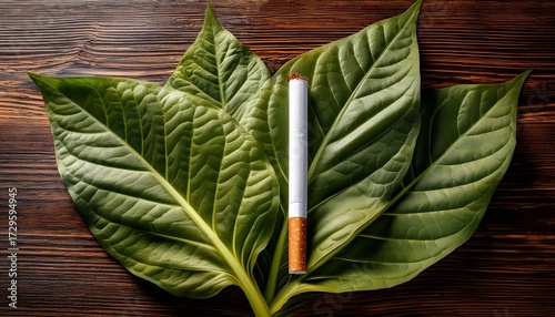 © Diego, Obraz premium Cigarette Placed On Raw Tobacco Leaves With A Textured Background