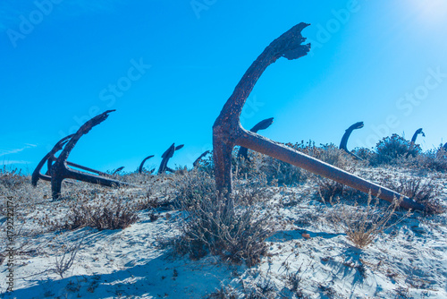 © ODIN Daniel, Fototapeta premium Cimetière des ancres à Tavira au Portugal. Ancres rouillées posées sur une plage de sable.