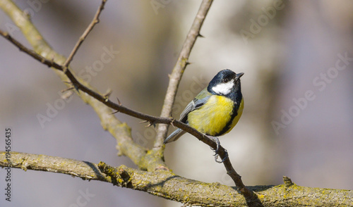 © fotonaturali, Naklejka premium Cinciallegra posata sul rametto del bosco in inverno