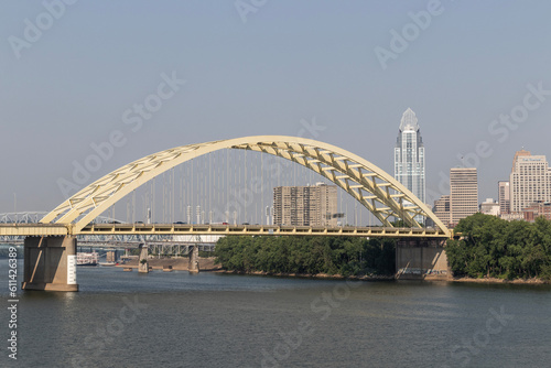 Naklejka premium Cincinnati Downtown Skyline including the Great American tower and Daniel Carter Beard Bridge along the Riverfront.