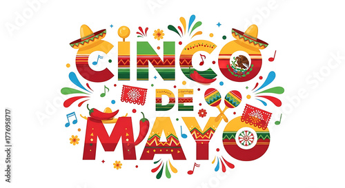 © Sonkear, Fototapeta premium Cinco de mayo text decorated with mexican elements isolated on white background