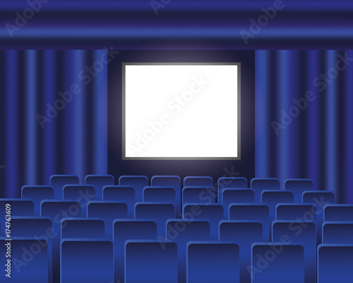 Obraz premium Cinema auditorium with blue seats and blank screen. Vector illustration