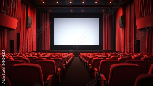 Fototapeta premium Cinema auditorium with red seats and large screen