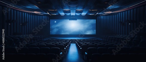 Fototapeta premium Cinema hall with empty seats and projector screen. Entertainment and leisure.