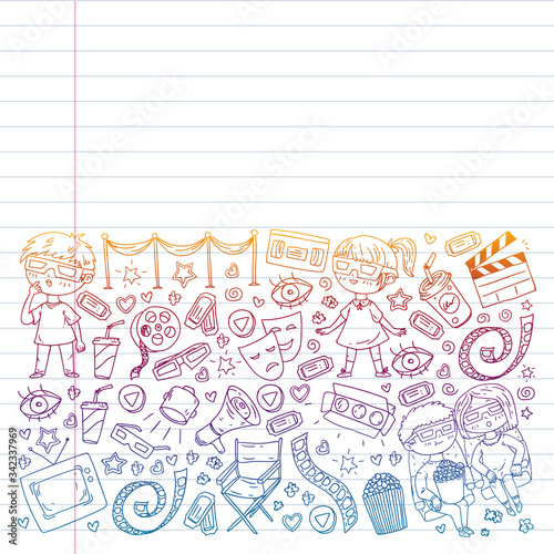 © Anastasia, Fototapeta premium Cinema pattern with vector icons for wrapping paper, posters, banners, leaflets. 3d movie, tv, musical.