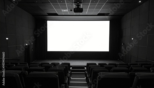 © Eggy, Fototapeta premium Cinema Projection Screen Mockup - Background for Application Presentation - Template for Movie Screen - Wide Screen in Theathers - White Screen for Product, Interface Design - App, Web, UI Design