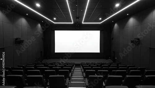 © Eggy, Fototapeta premium Cinema Projection Screen Mockup - Background for Application Presentation - Template for Movie Screen - Wide Screen in Theathers - White Screen for Product, Interface Design - App, Web, UI Design