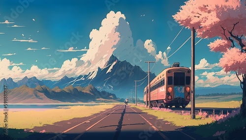 © Csaba, Fototapeta premium Cinematic anime style landscape of an abandoned railway station .Generative AI