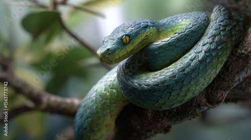 Naklejka premium Cinematic, high-res, realistic close-up of a vibrant snake coiled on a tree branch. Softly blurred lush natural panorama in background. Sharp focus, intricate scales.