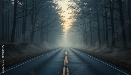 Fototapeta premium Cinematic mist rolling from the corners of an empty road through a shadowy forest at dawn