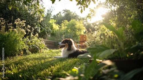 Fototapeta premium cinematic photo, sunny, Long-haired collie, garden in the background