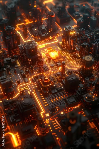 © lertsakwiman, Fototapeta premium Cinematic Study of Complex Analytical Functions Depicted Through Intricate Pathways of a Dramatic, Moody Electronic Circuit Landscape