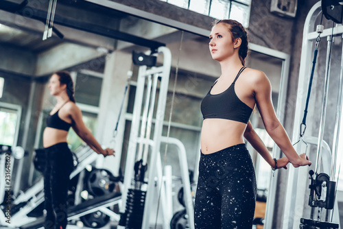 © totojang1977, Obraz premium Cinematic tone of young attractive fitness woman exercise with machine in gym. Individual sport to fit muscles of body for healthy life concept