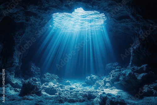 © k, Obraz premium Cinematic Underwater Scene with Sunlight Rays and Marine Life in Deep Blue Ocean