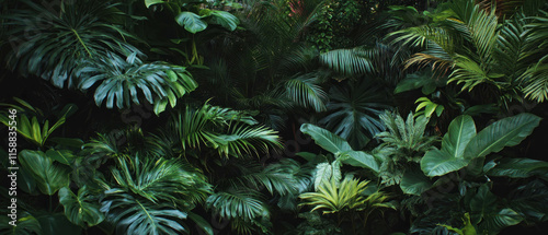 © annetdebar, Fototapeta premium Cinematic view of a vibrant tropical rainforest canopy from above during daylight hours