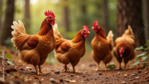 Fototapeta premium Cinnamon Queen chickens foraging on a forest floor, surrounded by trees and...