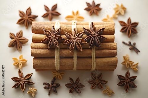 © Liza, Fototapeta premium Cinnamon sticks tied with twine and star anise arranged on white background