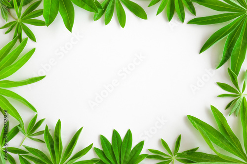 © fotoduets, Fototapeta premium Circle created from lupine flowers green leaves on the white background. Greeting card in green jungle style. Summer time.
