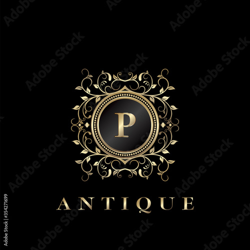 © SimpenArt, Fototapeta premium Circle Nature Leaf Luxury Letter P logo. Antique elegance vector design floral ornament on circle frame with gold vintage . Vector logo template, wedding labels and badges