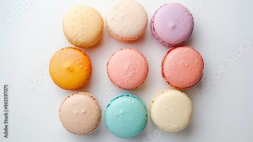Obraz premium Circle of assorted pastel macarons on a trendy white background, viewed from...