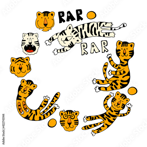 Fototapeta premium Circle of cute tigers. Vector illustration.Wild animal. Symbol of 2022. Cute animal character idea for child and kid printable stuff and t shirt, greeting card, nursery wall art, postcard