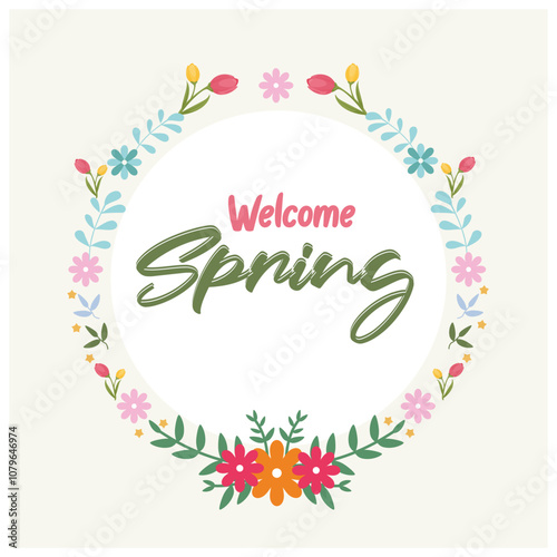© berkah design, Obraz premium Circle wreath. Round frame with spring flowers. Spring Flourishing concept. Flat vector illustration.