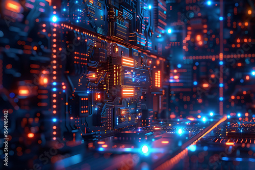 Fototapeta premium Circuit board glowing blue orange lights technology