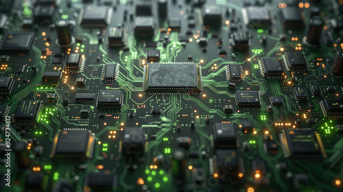 Fototapeta premium Circuit board microchips with green backlight. Nanotechnology sustainable...