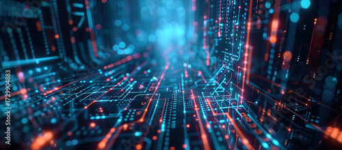 Fototapeta premium Circuit board network visualization: Dynamic circuit board with glowing lines...