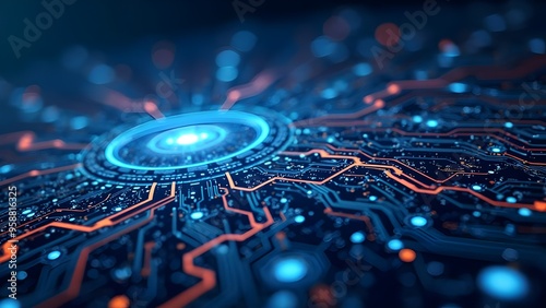 © Dackshina, Fototapeta premium Circuit board technology wires circuitry hardware blue neon abstract background futuristic computer