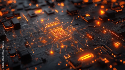 Obraz premium Circuit board with glowing microchip, technological design, illuminated