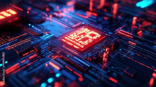 © batara, Obraz premium Circuit Board with Glowing Red Chip