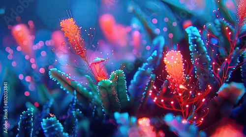 Fototapeta premium Circuit forest illuminated by neon glow, with digital fauna roaming amidst...
